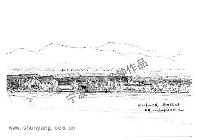 回到家里,我搜索一切可以為我聯(lián)想當年校區(qū)的東西,并找到了自己已泛黃的高中畢業(yè)照,又從母親那里找到了當年老媽在一中教書時的幾張師生合影照,從照片的背景中慢慢建立起場景聯(lián)想,還數(shù)次致電幾位老同學核實校舍細節(jié)。到下午13:30我就開始畫起了回憶畫,直至傍晚形成了《記憶中的母校——余姚中學舊景》鋼筆畫。
