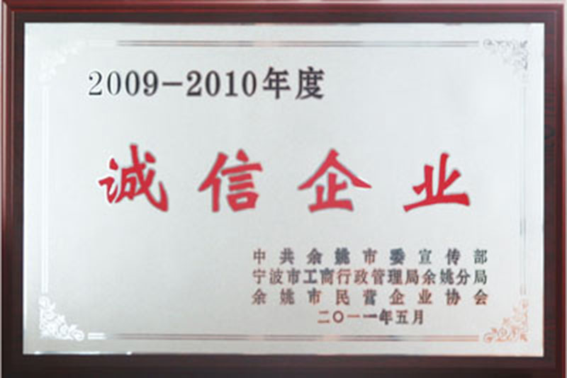 2011年5月,被中共余姚市委宣傳部、寧波市工商行政管理局余姚分局、余姚市民營(yíng)企業(yè)協(xié)會(huì)聯(lián)合評(píng)定為2009-2010年度“誠(chéng)信企業(yè)”