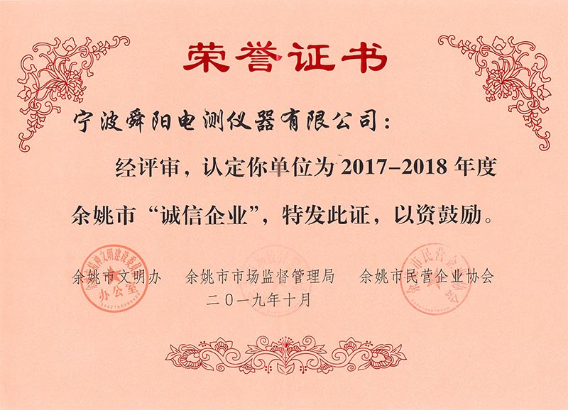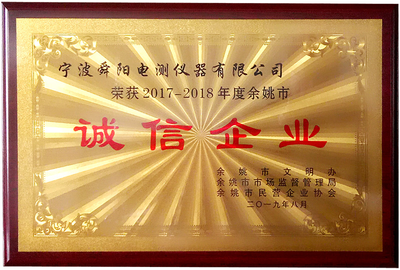 2019年8月,被余姚市文明辦、余姚市市場監(jiān)督管理局、余姚市民營企業(yè)協會聯合評定為2017-2018年度余姚市“誠信企業(yè)”