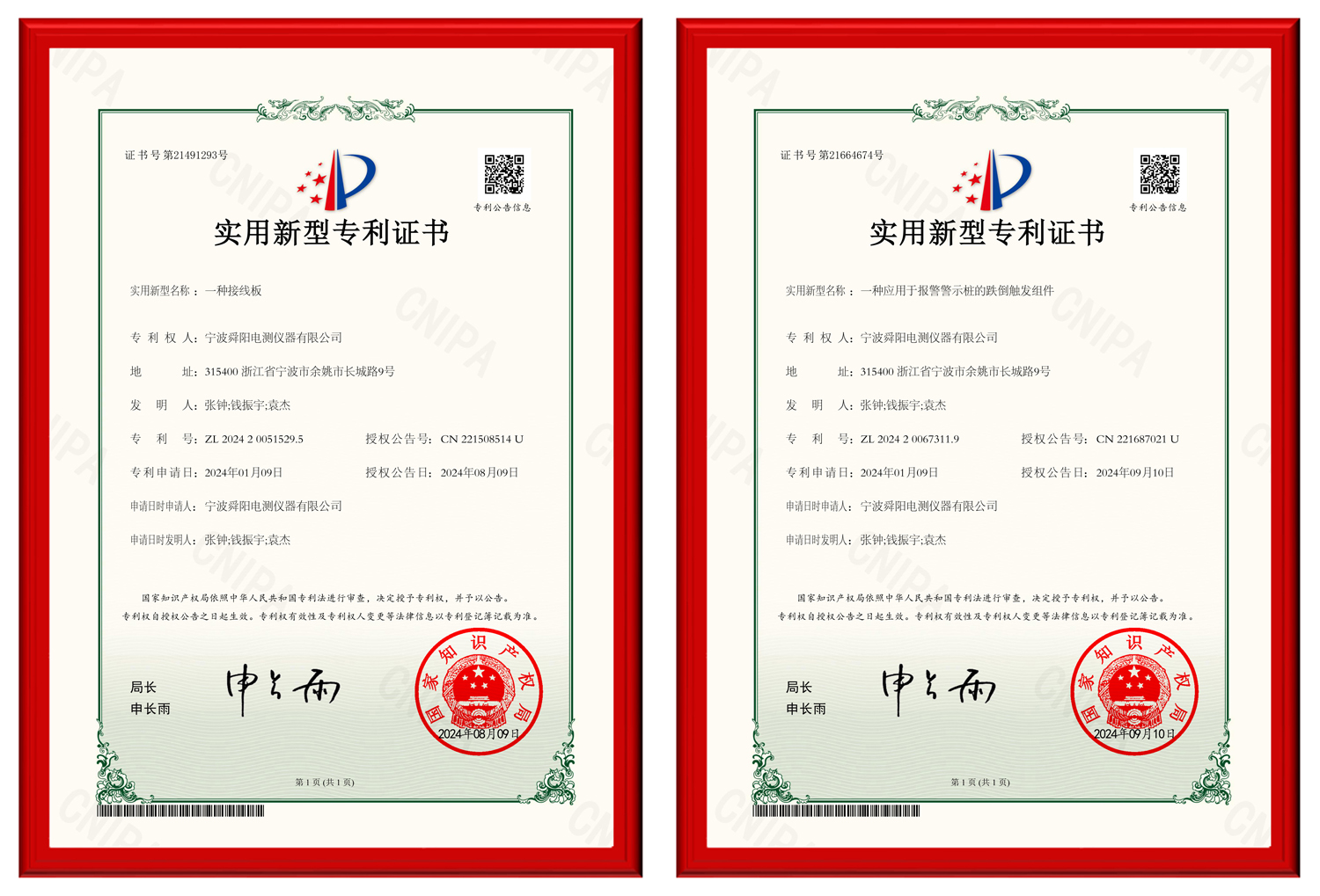 2024.10.28獲悉:我司申請的兩項實用新型專利均已審查通過,獲得國家知識產(chǎn)權(quán)局的授權(quán),它們是:一種應(yīng)用于報警警示樁的跌倒觸發(fā)組件,一種接線板.專利號分別為ZL2024 2 0067311.9、ZL 2024 2 0051529.5。加上今年5月獲得的一項發(fā)明專利,我司今年已獲得三項專利。