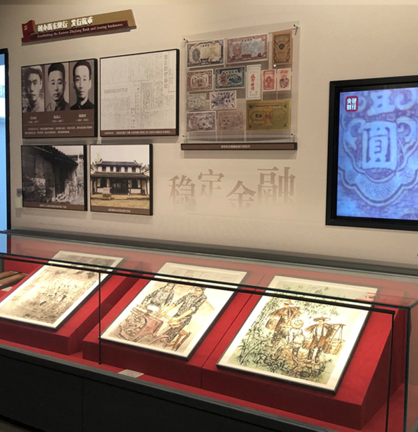 在介紹浙東銀行抗幣發(fā)行的內(nèi)容前,大家看到了在櫥窗里的三幅畫,展現(xiàn)的是《浙東銀行成立》《抗幣印刷》《抗幣運輸》,亦系作者張鐘接受市委黨史辦下達的任務,于前幾年寫實創(chuàng)作的浙東銀行系列作品之縮小件。